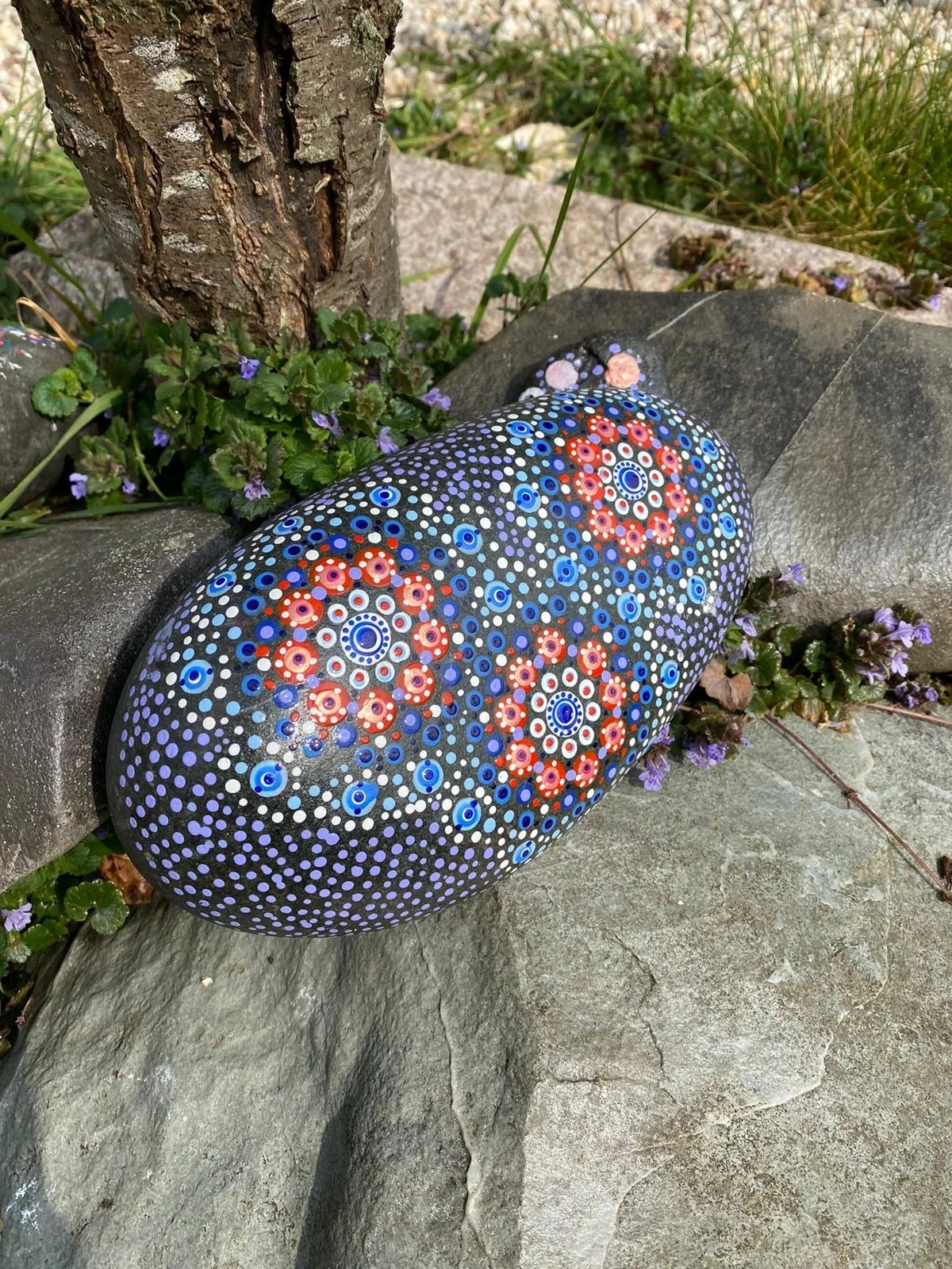 Maar naast het schilderen van vissen, schilder ik ook vogels en vergezichten over de IJssel. Daarnaast werk ik met porseleinverf op stenen die ik vind. Het stippen van stenen komt oorspronkelijk uit Australië. De Aboriginals zijn de eersten die met behulp van stippen afbeeldingen maakte van de kosmos, de dieren, de planten en de mensen; als een kosmische eenheid. De verhalen die stenen je kunnen vertellen komen eruit via de stippen die intuïtief op de stenen belanden. Los van de diepere betekenis en het meditatieve element van stippen op stenen is het ook een prachtig sierraad in de tuin!